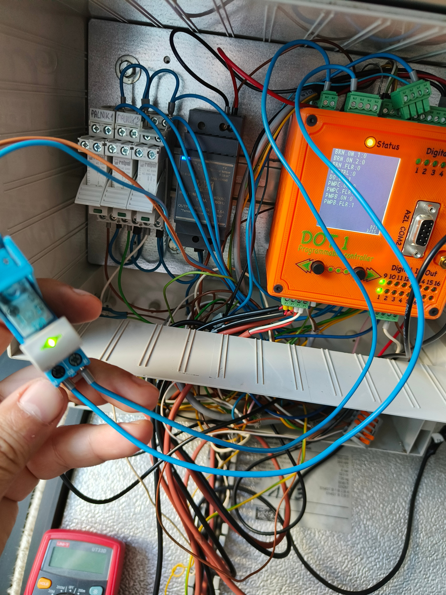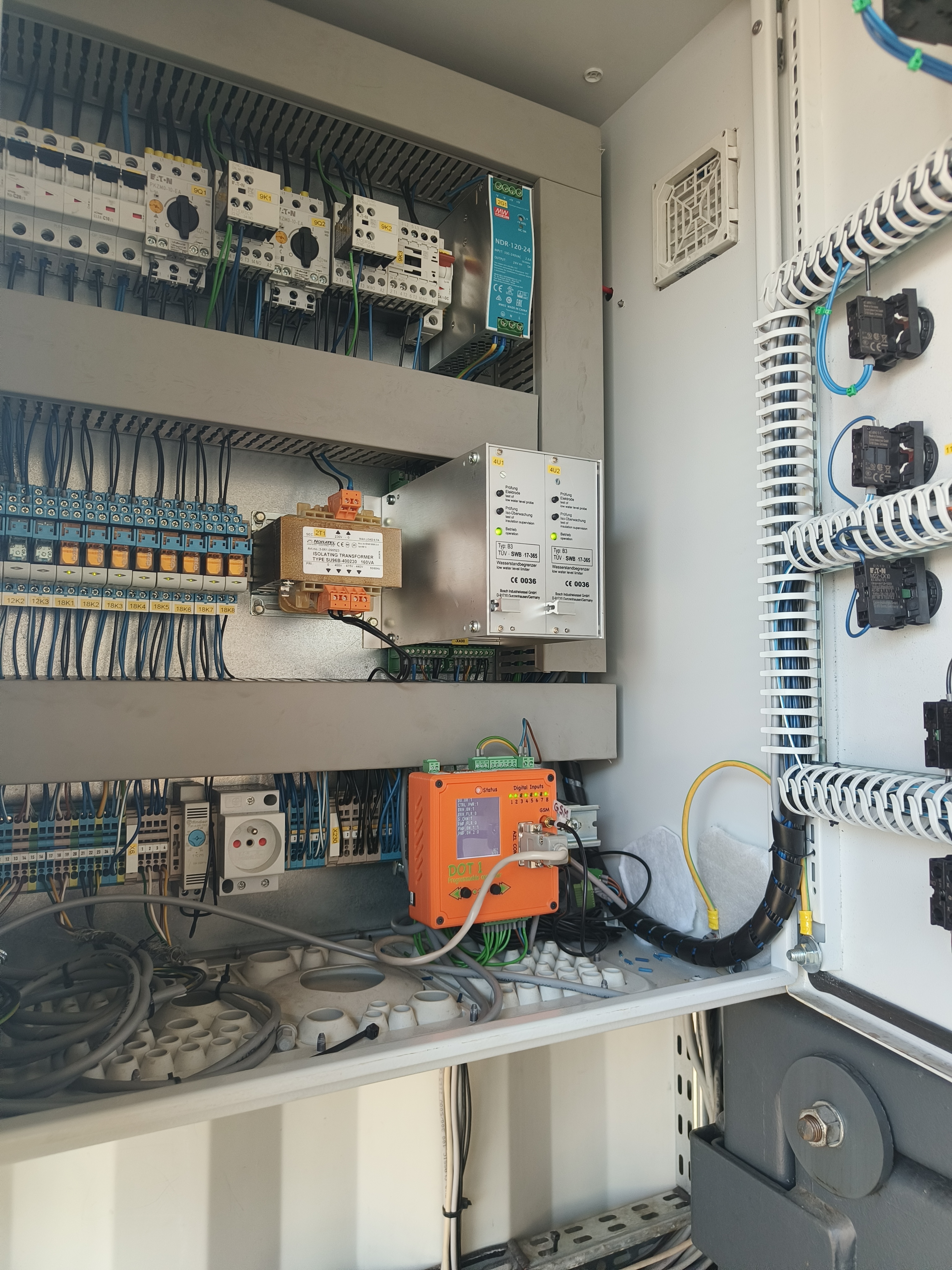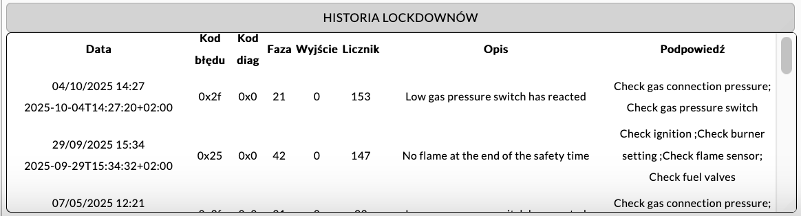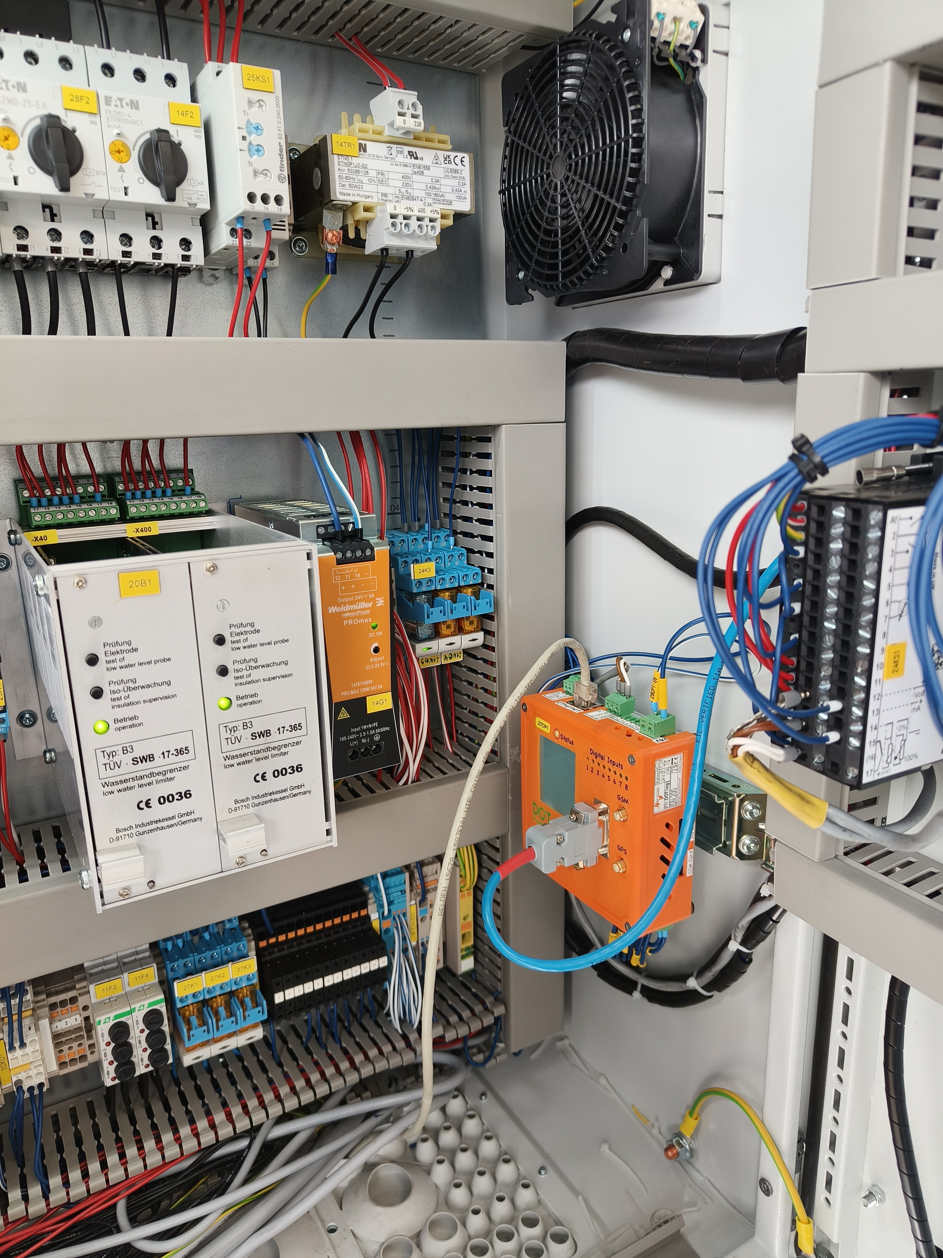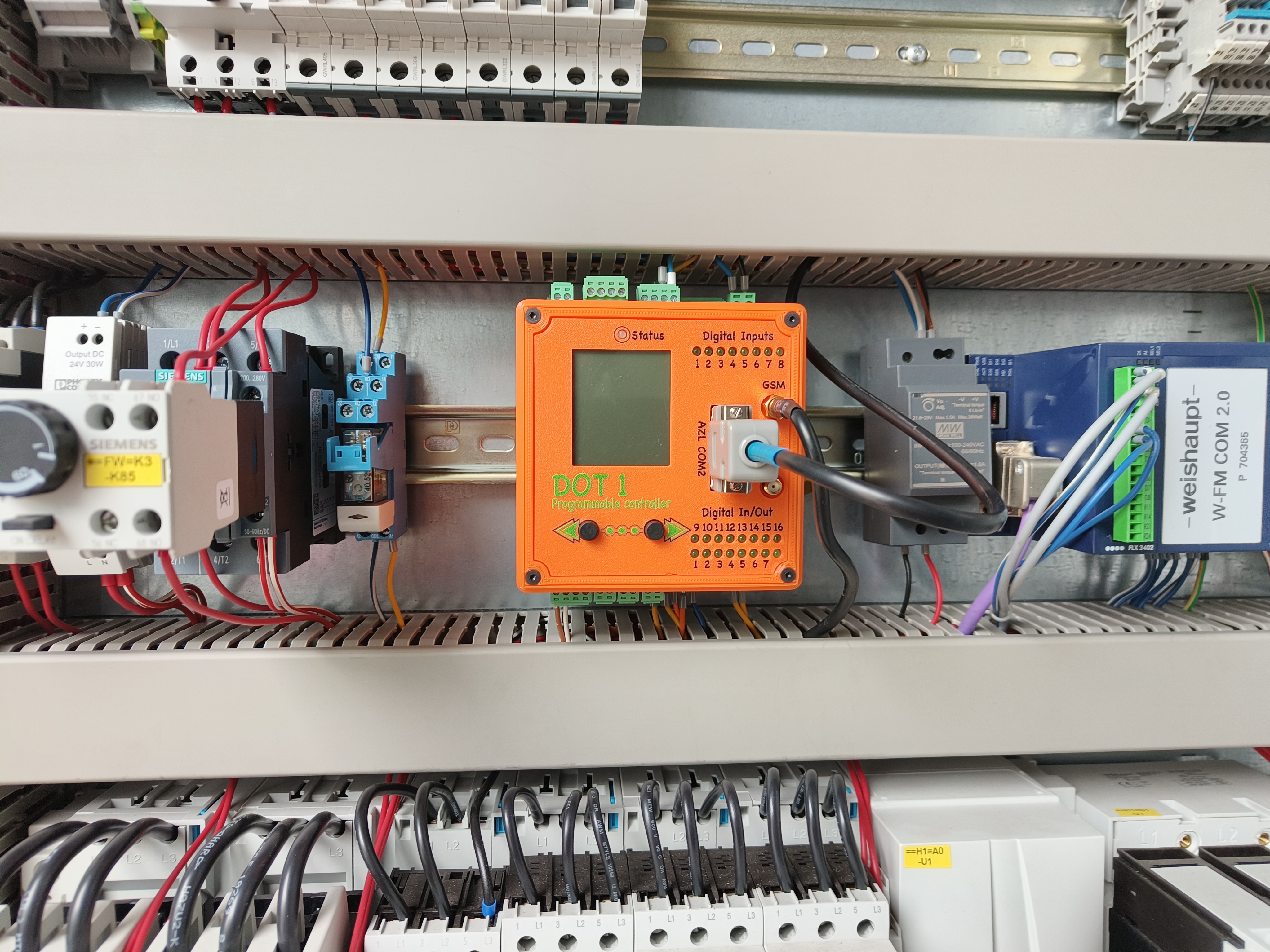 Instalacja z kotłowni wodnej 2,7 MWW trakcie instalacji w kotłowni 360 kWKotłownia parowa około 2 T/hParowa kotłownia kontenerowa – Weishaupt W-FM100 podłączony do RS232_1instalacja w osobnej skrzyncePrawie kompletne obsadzenie wyjść cyfrowych i temperaturpodłączony przetwornik ciśnienia 4-20mAPpodłączony W-FM100 poprzez złącze D-SUBDOT1 Slim dodany do kotłowni starszego typuMenadżer palnika W-FM100 podłączony zwykłą skrętką do RS232_1DOT1 podłączony do W-FM100 za pomocą D-SUBSzybka instalacja w kotłowni parowejDuże obsadzenie wejść cyfrowychPodłączone 4 RTDPrzetwornik ilości paliwa na ścianie Magazynu PaliwaWizualizacja widoku na żywo kotłowni wysokoparametrowej 2.7MW, przy pracy na gazie ziemnymHistogramy pracy kotłowni 2,7MW, praca na gazie, magazyn paliwa jest niepodłączonyWgląd w kody błędów palnika Weishaupt W-FM100/200